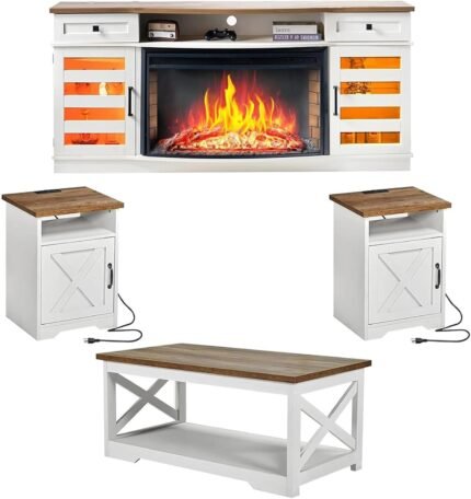 AMERLIFE 4 Pieces Living Room Table Sets, 70″ Farmhouse TV Stand with 33″ Electric Fireplace, Coffee Table & 2 End Tables with Charging Station and USB Ports, Living Room, White & Barnwood