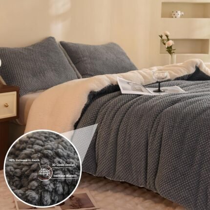 3D Jacquard Design Comforter Set, Ultra-Soft Warm Queen Size Sherpa Fur Plush 3-Pieces Sets Luxury Cozy Bedding with 2 Pillowcases (90″x90″, Grey)