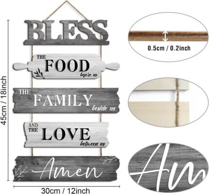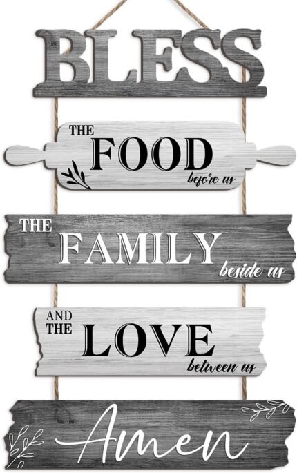 Pigort Kitchen Wall Decor Bless the Food Before Us Dining Room Wall Decor – Farmhouse Wall Art For Kitchen Dining Room- Wooden Rustic 5pcs Roped Sign 12×18 Inches (Grey)