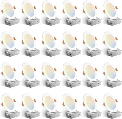Amico 24 Pack 6 Inch 5CCT Ultra-Thin LED Recessed Ceiling Light with Junction Box, 1050LM Brightness, Dimmable Canless Wafer Downlight, 12W, ETL&FCC