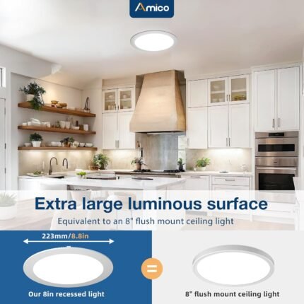 Amico 12 Pack 8 Inch 5CCT Ultra-Thin LED Recessed Ceiling Light with Junction Box, 2700K/3000K/3500K/4000K/5000K Selectable, 18W Eqv 125W, Dimmable Canless Wafer Downlight, 1600LM High Brightness -ETL