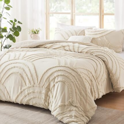 ENJOHOS Boho Queen Comforter Set Beige Tufted Rainbow Bedding for Queen Size Bed, 3 Pieces Lightweight Soft Microfiber Cream Comforter with 2 Pillow Cases for All Season