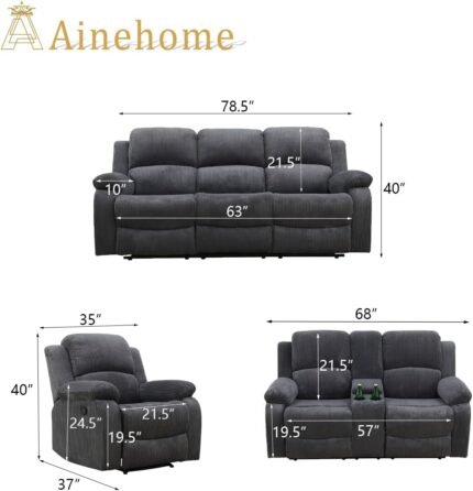 A Ainehome Living Room Furniture Set Recliner Sofa Set Loveseat Chair Furniture Sofa Set Grey Corduroy for Living Room/Rv/House/Theater Seating (A-Dark Grey Corduroy, 3 Piece Set)
