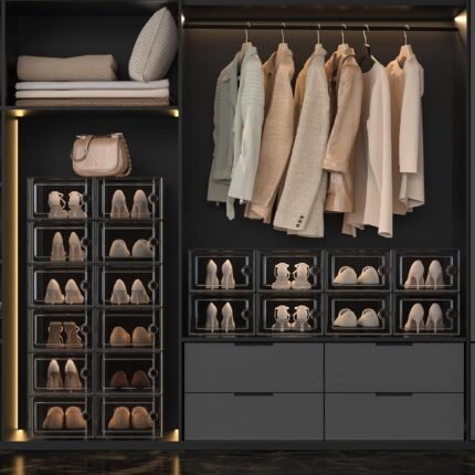 Kuject X-Large Shoe Storage Boxes Organizers Clear Plastic Stackable 12 Pack, Shoe Rack & Holder Substitute, Sneaker Containers, Toy Storage Organizer Bins for Entryway, Closet, Under Bed, Black