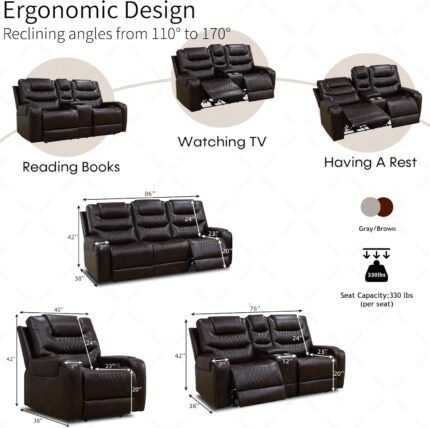 3 Seater Recliner Sofa Set with 2-Tier Cushion, 3+1+1 Pieces in Living Room, 3 Seater Reclining Couch Leather with Removable Console, 2 Oversize Recliner Chair Sofa Seat