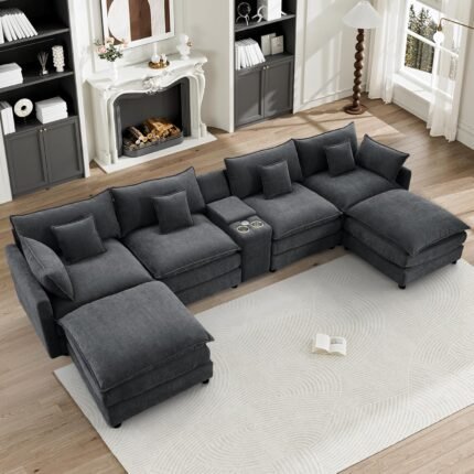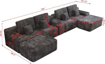 KEIKI 150″ U-Shaped Oversized Corduroy Modular Sectional Sofa with 2 Ottomans and Multi Functional Console, 6-Seater Upholstered Couch with USB and 2 Cup Holder, Easy Assembly, for Living Room, Black