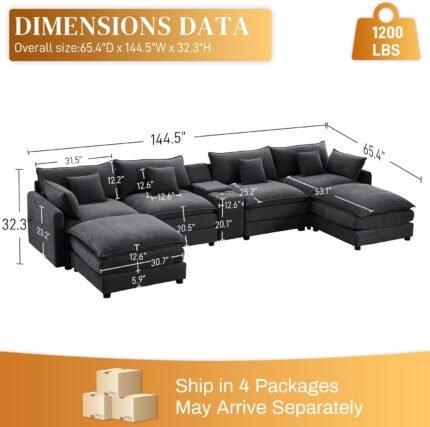 HYJT-H&K 145″ U Shaped Cloud Couch Modular Black Sectional Couches for Living Room, Comfy Fluffy Chenille Oversized Cloud Sectional Couch Large 6 Seat Sectionals Sofa Set Central Console USB Port