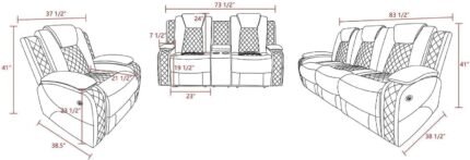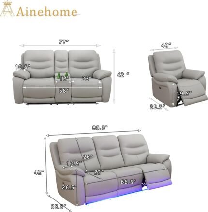 A Ainehome LED Power Recliner Sofa for Living Room Furniture Set, Leather Sectional Sofa Set, Reclining Sofa and loveseat with USB Port/Storage Console/Cup Holders(Grey 3-Piece Set)