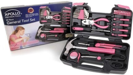Apollo Tools 39 Piece General Household Tool Set in Toolbox Storage Case with Essential Hand Tools for Everyday Home Repairs, DIY and Crafts – Pink Ribbon – Pink – DT9711P