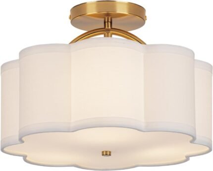 Semi Flush Mount Ceiling Light, 11.8″ Modern 3-Light Fixture with Petal-Shaped Cream White Fabric Shade and Golden Support Arm, Ideal for Bedroom, Kitchen, Living Room, Hallway, and Entryway