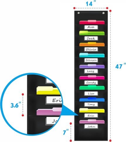 Vantasii Organization Pocket Chart with 10 Pockets, Hanging Wall File Organizer, 2 Over Door Metal Hangers Included, 10 Dry-Erase White Labels,Organize Your Assignments, Files (Black, 14” x 47”)