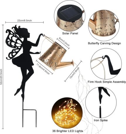 Ouddy Decor Fairy Garden Decor with Solar Watering Can, Metal Fairy Garden Statues with Hanging Lanterns Waterfall Solar Christmas Lights Silhouette Waterproof for Lawn Pathway Gardening Gifts