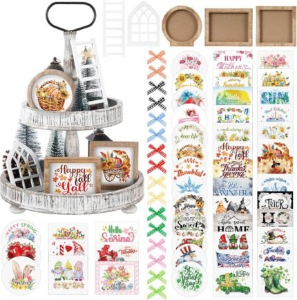 Bencailor 48 Pcs Interchangeable Seasonal Tiered Tray Decor Set Farmhouse Holiday Fall Halloween Tiered Decorations Include Wood Frames with Ladders Cards(Lovely Color,Holiday)