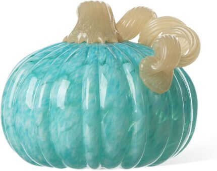 Glitzhome Hand Blown Glass Pumpkin Decor 5″ Turquoise – Artisan Fall Harvest Thanksgiving Table Centerpiece Halloween Home Decor