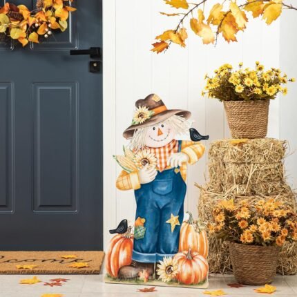 glitzhome Fall Wooden Welcome Sign Scarecrow Hanging Wall Decor Porch Sign, 30″ H