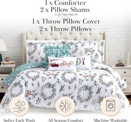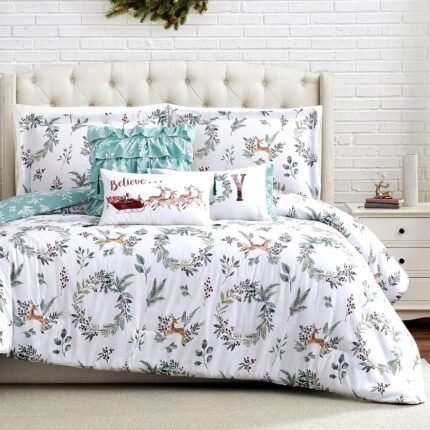 Southshore Fine Living, Inc. 6-Piece Reversible Christmas Bedding Queen, White Christmas Comforter Set Queen Size/Full, 2 Throw Pillows, 2 Shams, 1 Throw Pillow Cover, Holiday Bedding – Happy Holidays
