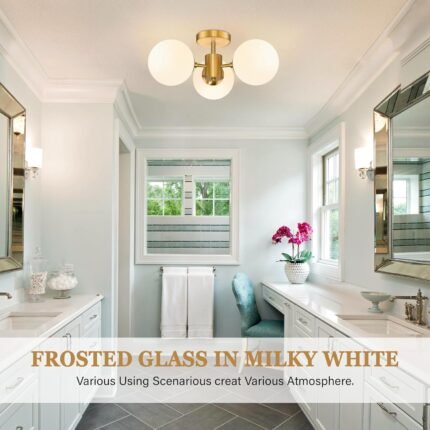Mid Century Modern 19 Inch Brass Semi Flush Mount Ceiling Lights 3-Light Frosted Globe Glass Gold Chandelier Modern Light Fixtures Ceiling Lights Fixture for Bedroom Hallway Entryway