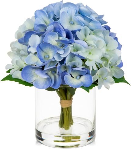 Hollyone Blue Hydrangea Artificial Flowers in Vase Latex Real Touch Small Faux Hydrangea Flowers Arrangements Hydrangeas Fake Flower with Glass Vase with Faux Water for Table Centerpiece Home Decor