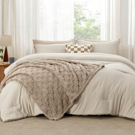 Bedsure Comforter Full Size 5 Pieces – Full Size Comforter Set with Fleece Throw Blanket and Decorative Pillow, Lightweiget Bedding Comforter Sets, All Season Bedding Sets, Khaki