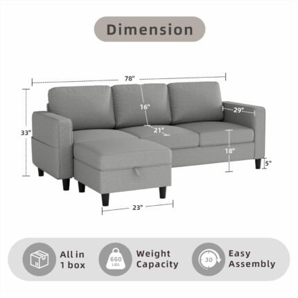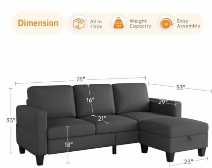 Sectional Sofa Couches for Living Room, 78” Dark Grey 3 Seater L-Shaped Couch with Storage Ottoman, Comfy Fabric Convertible Sectionals Sofas with Chaise for Apartment, Office, Small Space