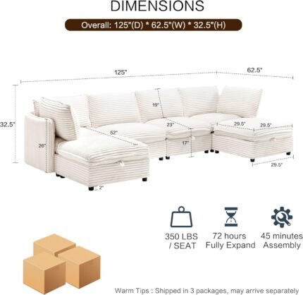 Oversized Modular 6 Seater Sofa with Removable Covers and Storage, Convertible U, L-Shaped and Sleeper Sectional, Modern Corduroy Couches with Ottoman Chaise for Living Room, White