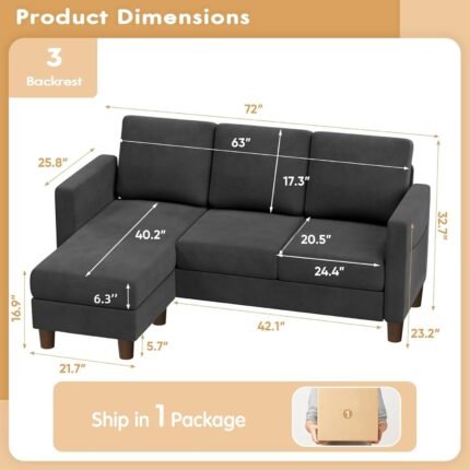 VICTONE Convertible Sectional Sofa Couch, 3 Seat L-Shaped Sofa with Linen Fabric Ottoman Small Couch for Small Apartments, Living Room and Office (Linen Fabric, Dark Gray)