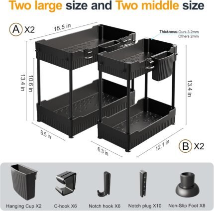 2 Pack Multi-Purpose Pull-Out Storage Organizers, Under Sink Organizers and Storage for Bathroom & Kitchen, Under Cabinet Organizers and storage, 12.8 Inch, Black
