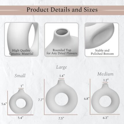 VELOVA Set of 3 White Ceramic Vase with 65 PCS Dried Pampas Grass Flowers Aesthetic Boho Modern Small Round Cute Vases for Decor Living Room Coffee Table Shelf Bedroom Office Desk Home Gifts Women Mom
