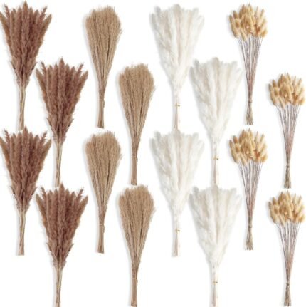 400 PCS Small Boho Pampas Grass, 17″ Naturally Dried Pompas, Pampas Grass Decor for Wedding , Boho Party Decorations, Table Decor(Brown and White)