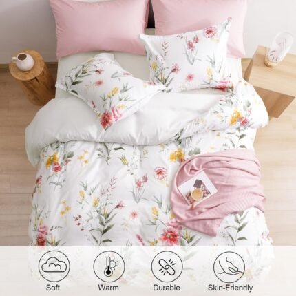 PHF Ultra Soft Floral Duvet Cover King Size, Printed Bedding Set 3 Pieces, Comfy Durable Farmhouse Duvet Cover Set with 2 Pillow Shams, Zipper Closure and 8 Ties, 104″x90″, White & Yellow
