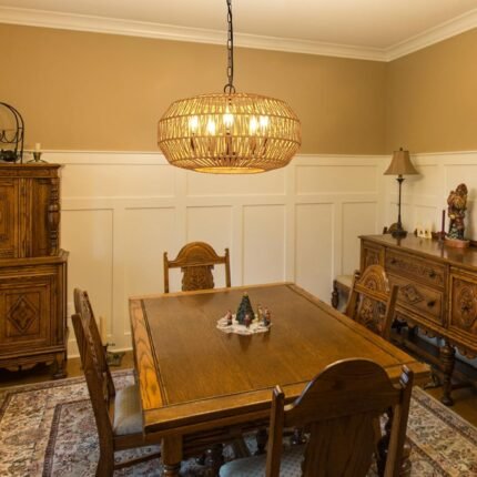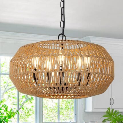 Boho Rattan Chandeliers for Dining Room Light Fixture, 5-Lights Large Farmhouse Pendant Lighting with Wicker Shade, Coastal Basket Chandelier for Living Room Kitchen Island Bedroom Foyer