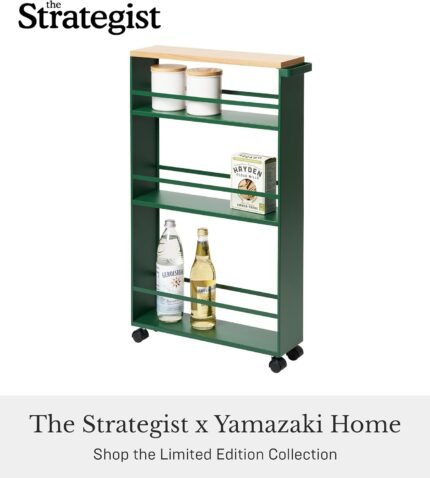 Yamazaki Home Rolling Slim Storage Three Tier Utility Cart with Handle, Space Saving for Kitchen | Steel, One Size, Forest Green