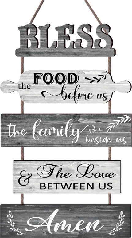 Buecasa Bless the Food Before Us Farmhouse Kitchen Wall Decor – Dining Room Decorations Collage Wall Art in White Grey Color – Wooden Rustic 5pcs Roped Wall Sign 13×24 Inches Vertical