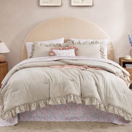 Queen Comforter Set – 7 Pieces Ruffle Beige Bedding Sets, Shabby Chic Farmhouse Bed in a Bag Queen with Ruffle Comforter, Floral Sheets, Pillowcases & Shams