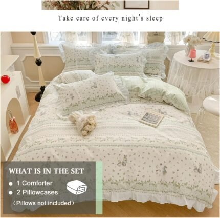 VM VOUGEMARKET Girls Flower Comforter Set Green Leaves with Cute Rabbit Comforter with 2 Pillow Shams Romantic Ruffle Down Comforter Set(3pcs,Queen)
