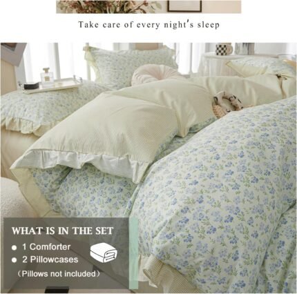 VM VOUGEMARKET Green Ruffle Comforter Set Queen Girls Blue Flower Comforter with 2 Lace Pillow Shams Romantic Cottagecore Bedding Set for All Seasons(3pcs,Queen)