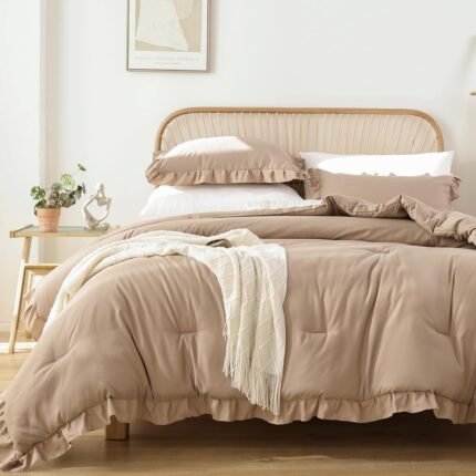 JANZAA Queen Ruffled Comforter Set 3PCS (1 Taupe Comforter Set and 2 Pillowcases) Vintage Farmhouse Shabby Chic Bedding Soft Fluffy Bed Set All Season