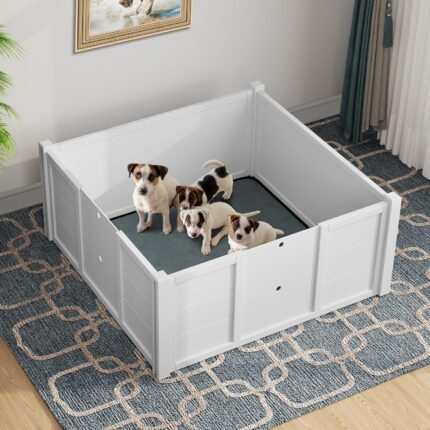 DWVO Whelping Box for Large Breed Dogs: Wooden Puppy Pen Indoor Puppies Playpen 39.4″x39.4″x17.7″ with Washable Pad & Removable Doors, Safe Birthing Space for Small Medium Corgi Poodle Husky (White)