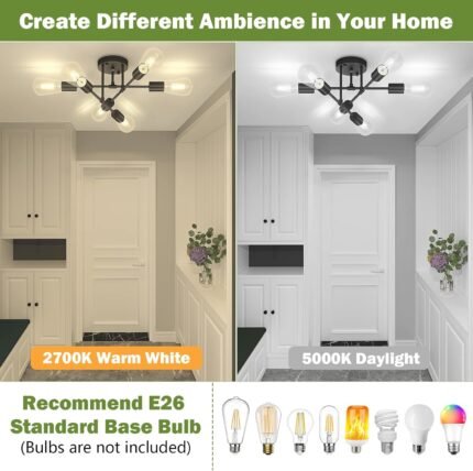 ASGYISA 8-Lights Semi Flush Mount Ceiling Light Fixture Modern Metal Black Sputnik Chandeliers with E26 Bulb Base Close to Ceiling Light for Kitchen Dining Room Living Room Hallway Bedroom