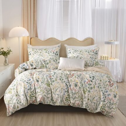 mixinni Fresh Soft Aesthetic Green Floral Comforter Set Queen Size, Boho Cottagecore Wildflowers Leaves Bedding Set, 1 Shabby Chic Comforter and 2 Pillowcases for All Seasons-Queen Size