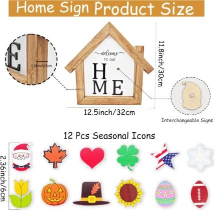 Interchangeable Home Table Sign with 12Pcs Seasonal Icons, Spring Decorations Tabletop Sign, Wooden Holiday Decor Shelf Sign