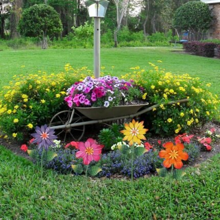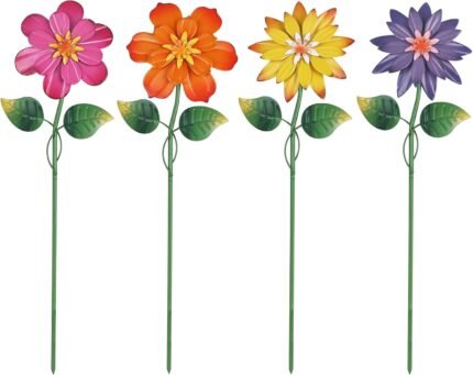 hogardeck Metal Flower Decorative Garden Stakes,4 Pcs 19″ Outdoor Garden Decor with Shaking Flower Head Yard Stakes, Yard Art Spring Decorations for Patio Lawn (Pink & Yellow & Purple & Orange)