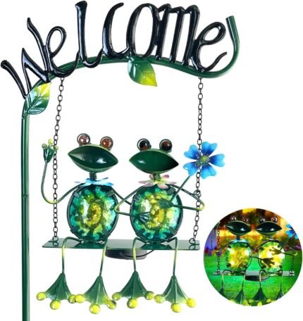HONGLAND Outdoor Garden Solar Lights,Frog Swing Garden Decor,Frog Decorative Stake with Welcome Sign for Landscape Patio Yard (48 inch)