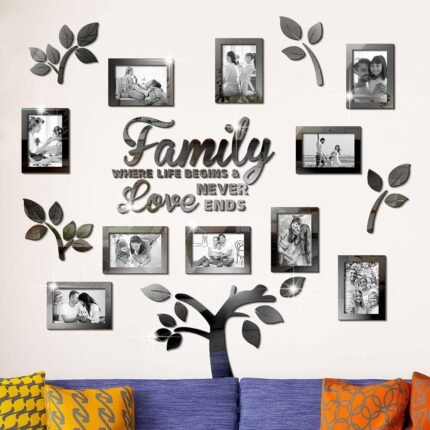 Family Tree Wall Decal Acrylic 3D DIY Mirror Sticker Photo Frames Removable Wall Art Decals Home Decorations for Living Room Bedroom Kitchen Dining Office, 47 x 47 Inch(Black)