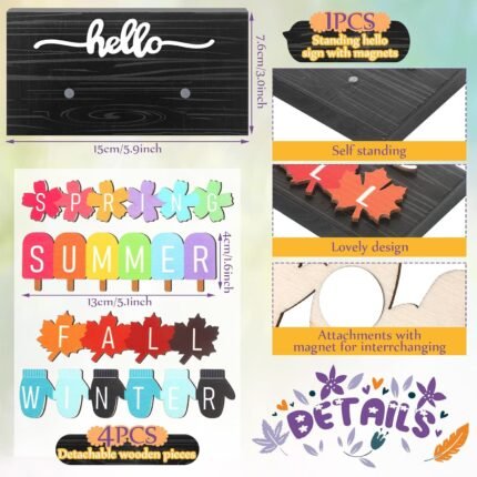 Roowest 5 Pcs Hello Fall Sign Interchangeable Seasonal Sign Spring Summer Winter Tiered Tray Decor 5.9 x 3 Inch Wooden 4 Seasons Farmhouse Table Centerpiece Decoration for Home Shelf Office(Basic)