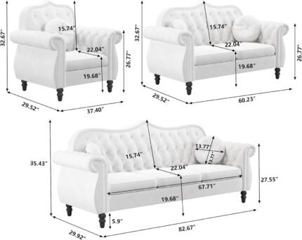 AVZEAR 3-Piece Living Room Sectional Sofa Set, Mid-Century Modern Chesterfield Upholstered Velvet Sofa Couch, Classic Tufted Button White Couch with Nailhead Trim for Living Room, Office (White)