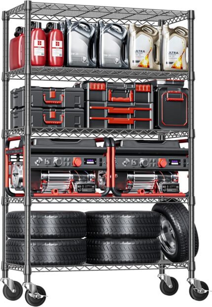 IZEUK 5-Tier Storage Shelving Unit with Wheels, Adjustable Heavy Duty Steel Wire Rack Organizer (Black, 17.7″ D x 47.2″ W x 76.7″ H, 1750 lbs Capacity) for Garage, Kitchen, Office, Laundry, Basement