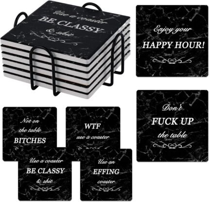 Funny Coasters for Drinks Absorbent with Holder, 6 Pcs Coasters Sets Ceramic Coaster with Cork Base Housewarming Gift New Home Apartment Kitchen House Decor Gift for Women Men