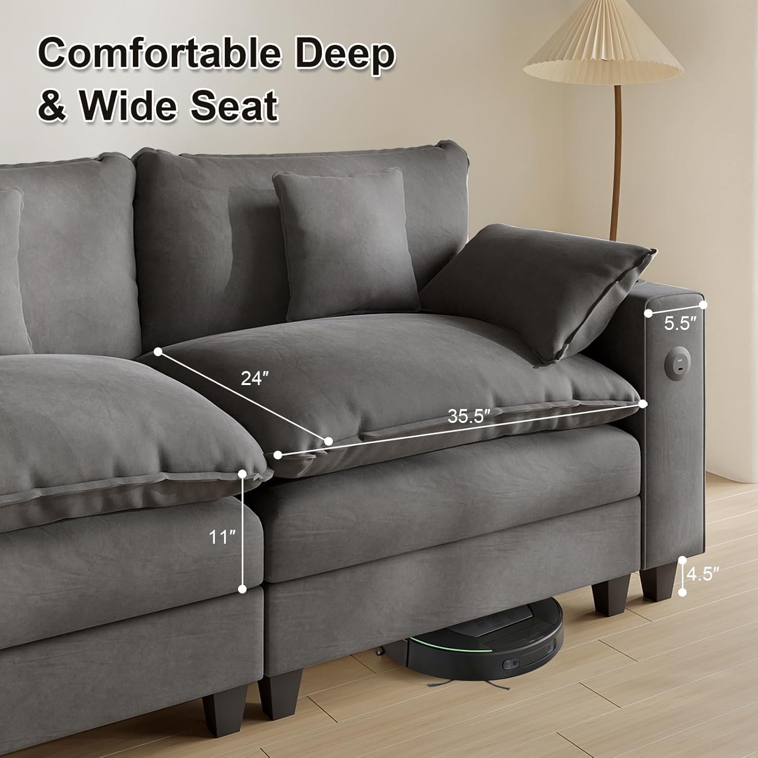 You must know, the way it looks in the sample pictures is NOT the way it looks in reality 😏. This couch is very comfortable if you are a person that likes to lay on a firm mattress for example. But I have a five-year-old son that likes to jump on couches😏. But I know now that😁, although he will climb all over this couch. He will not be doing much jumping because there is not enough cushion to jump on🤣 an have much to Any bounce. Then I am 5’7 an I can put my feet to either on the couch or the foot rest and still have plenty of room. This is a couch that will last for at least a couple years because of the firmness of it. But it’s the couch you get If you just want something to hang out on. It’s not necessarily the couch to get if you are trying to impress. The charging ports work great. But I will be personally adding cushion too, especially to the back pillows. For the price $700+200 in shipping it’s not bad.