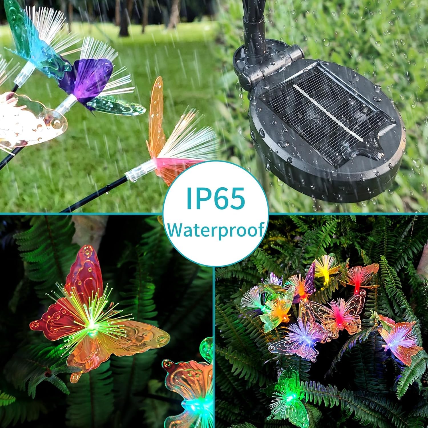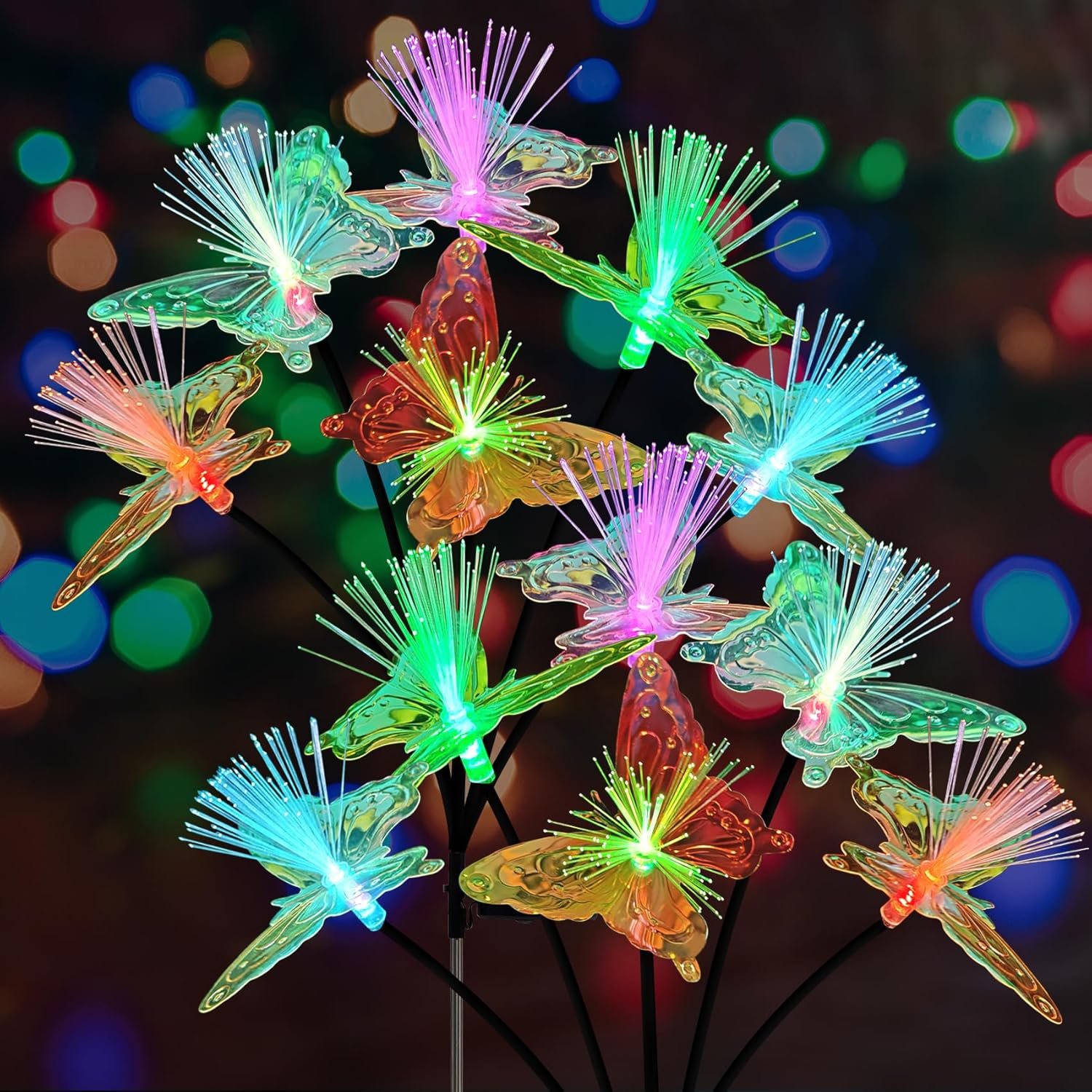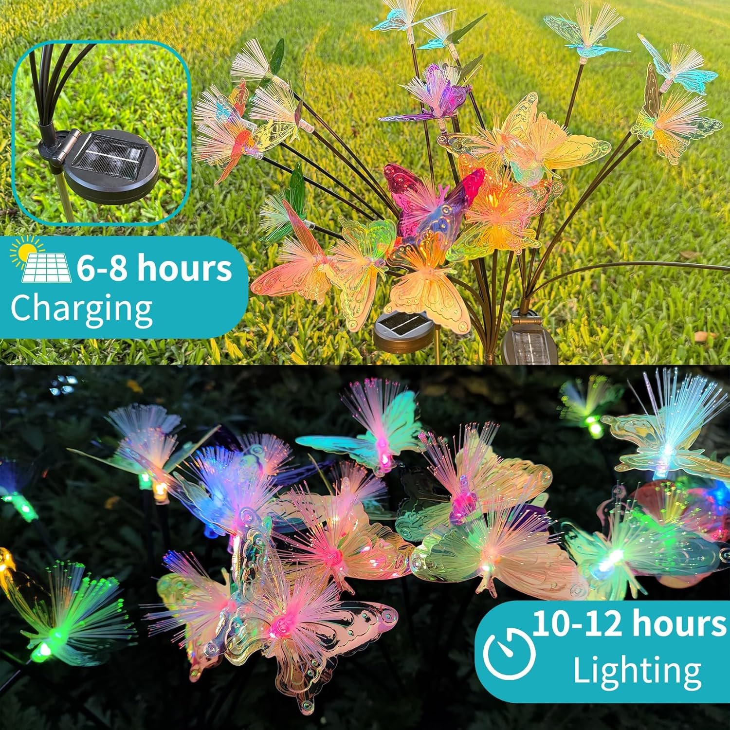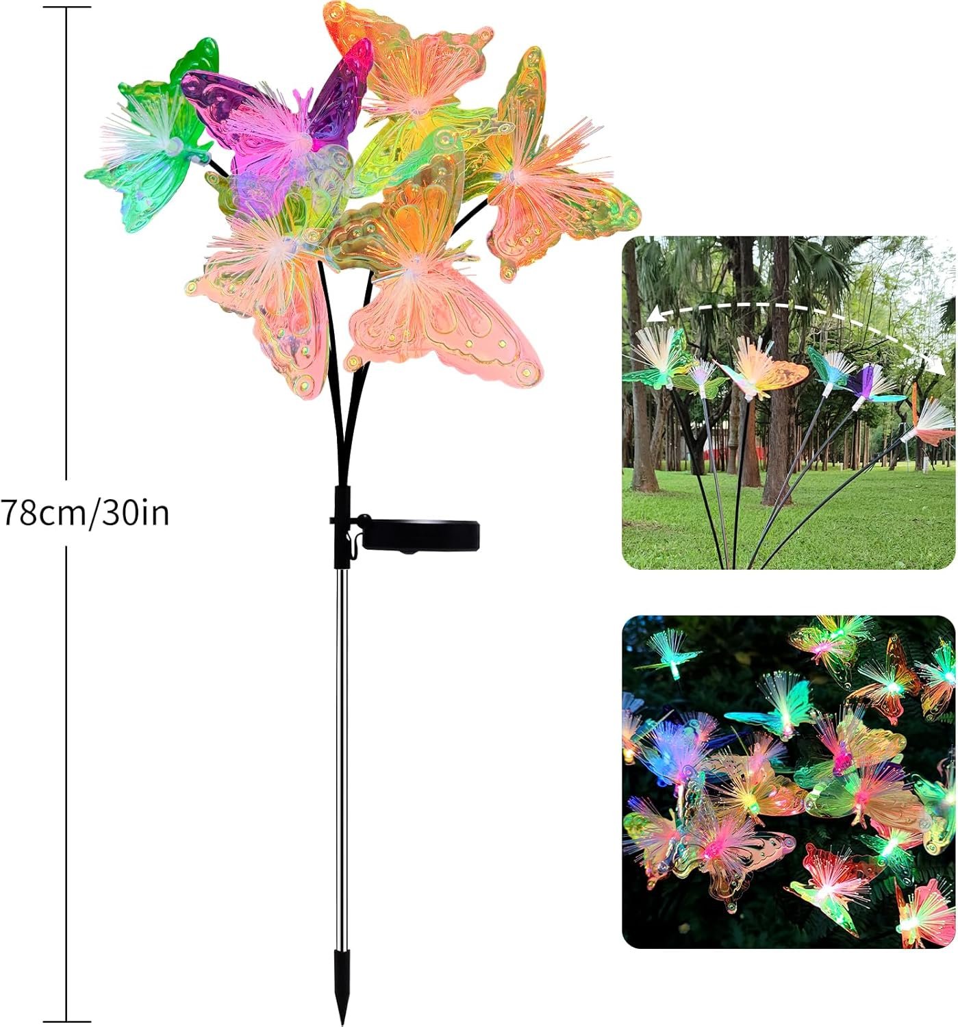 So far, these are the best solar lighted butterflies I have seen. The reason is that they use highly reflective colorful foil combined with fiber optic lights to create color on 2 levels, the light source and the reflectivity of the foil. The result is a very colorful display that makes others look dull in comparison.Economical, easy assembly and they run all night. Highly recommended.